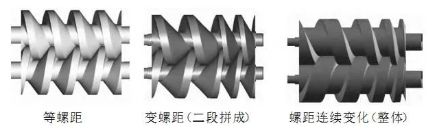 早期的螺桿真空泵是等螺距,為了降低能耗、降低泵腔內的溫度,后來又開發了變螺距的螺桿真空泵。其中一種螺桿是由二段螺距大小不等的螺桿拼接而成,另一種就是螺距連續變化的螺桿真空泵,螺桿由一個整體材料加工制作而成。各種不同的螺桿見圖1所示。